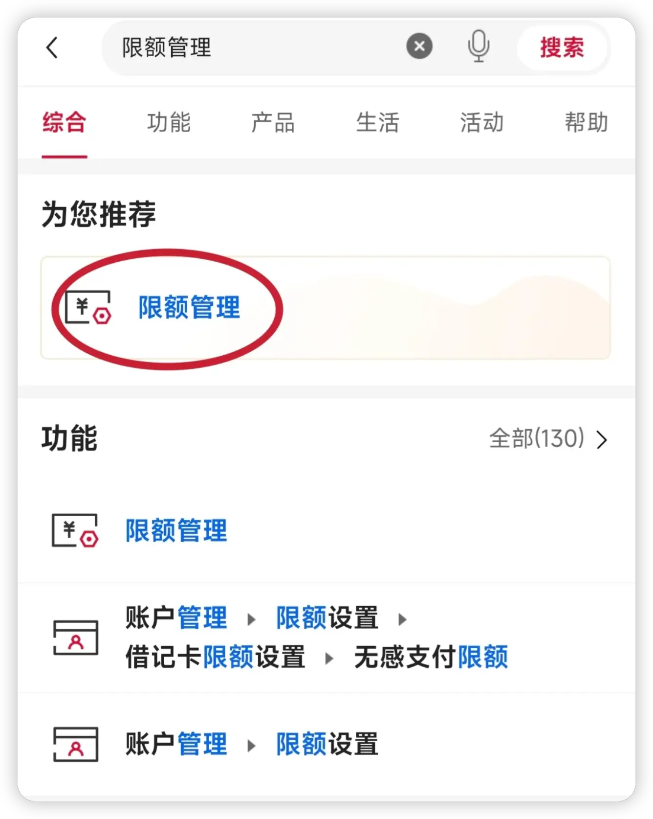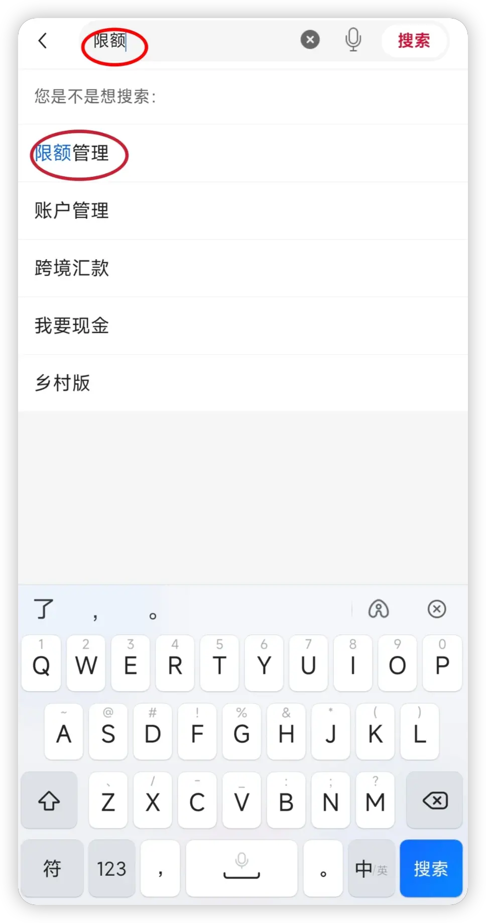 打开银行 APP,在首页最上方的搜索栏输入 “限额” 两个字。