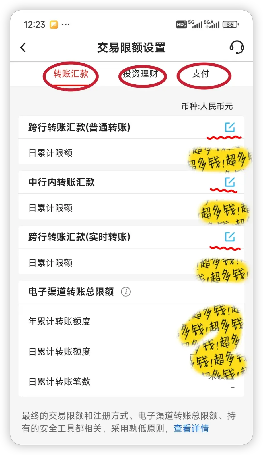 需要注意的是:不同银行的入口位置可能略有不同,如果一时找不到,可以在 APP 搜索栏里多试几个关键词,比如“限额设置”“转账额度”“交易限额”等,一般都能搜到!