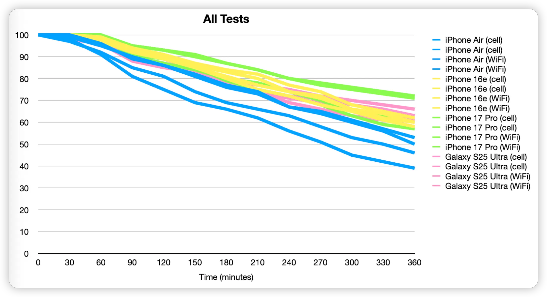 说到电池,iPhone Air 是个小巧的设备,电池也自然不大。通过我的一些测试,iPhone Air 的续航明显不如我平时使用的其他旗舰手机。虽然它的电池续航不会让你绝望,但和 iPhone 17 Pro 比起来,差距还是非常明显的。