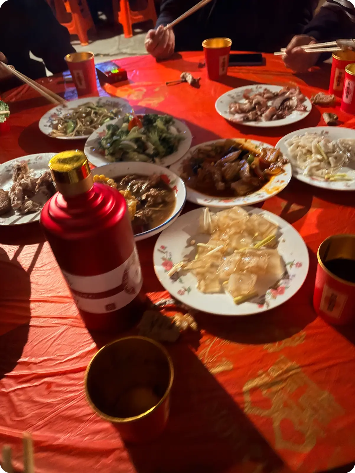 今天是 2025-10-26 九月初六,隔壁邻居家嫁女儿,白天举行了挂灯笼仪式。街坊邻居、亲朋好友都来了,家里里外外一片忙碌。中午就在家门口摆了将近四十桌酒席,这是我印象中在附近见过规模最大的一次宴席。菜式很简单,十个菜加主食水饺。只是人太多,主家可能也没预料到,菜的分量显得有点少。一盘炒西葫芦,七八个人一桌,刚上桌就见底,人均两块都不到。大家吃得倒是热热闹闹,气氛挺好,只是菜的量着实不够。
