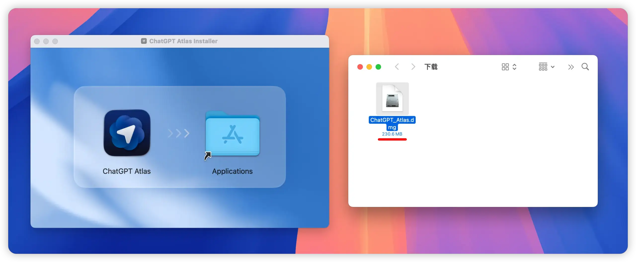 访问官方页面,下载 Atlas 浏览器安装包,大小约为 230MB。 - 安装浏览器