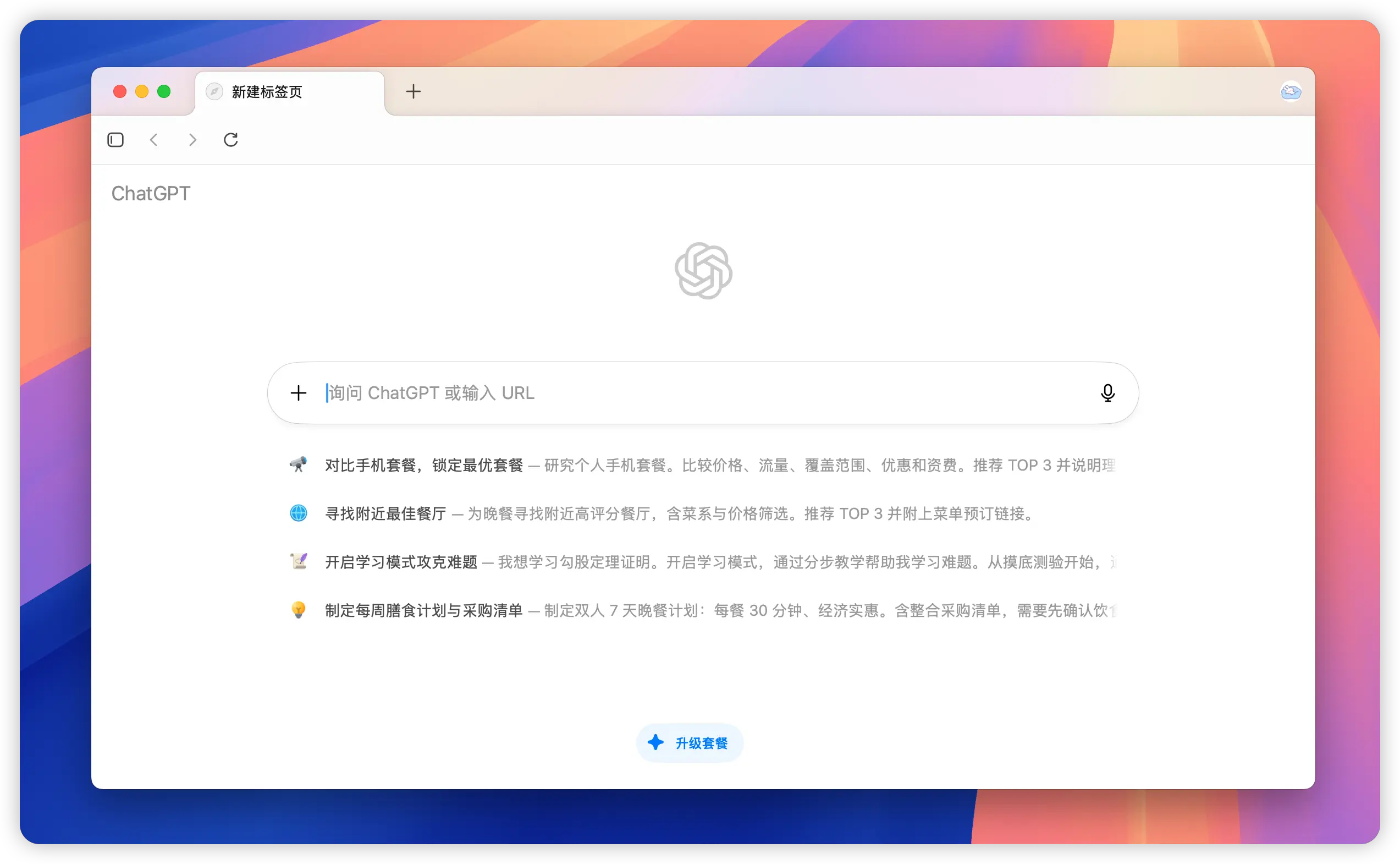 启动浏览器后,你会看到 Atlas 特有的启动页面,设计简洁,同时提供直接访问 ChatGPT 的快捷入口。