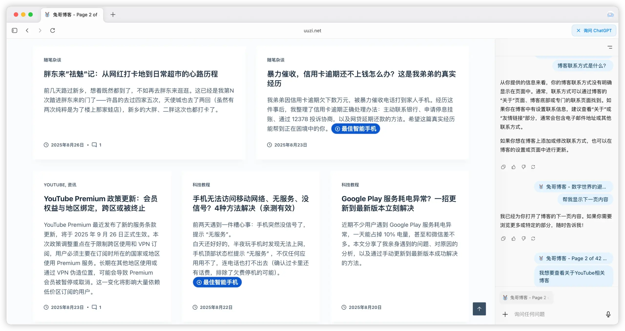 我尝试访问本博客,在左侧呼出侧边栏后,可以提问一些简单的问题。也可以执行一些简单的操作,比如说翻页操作。